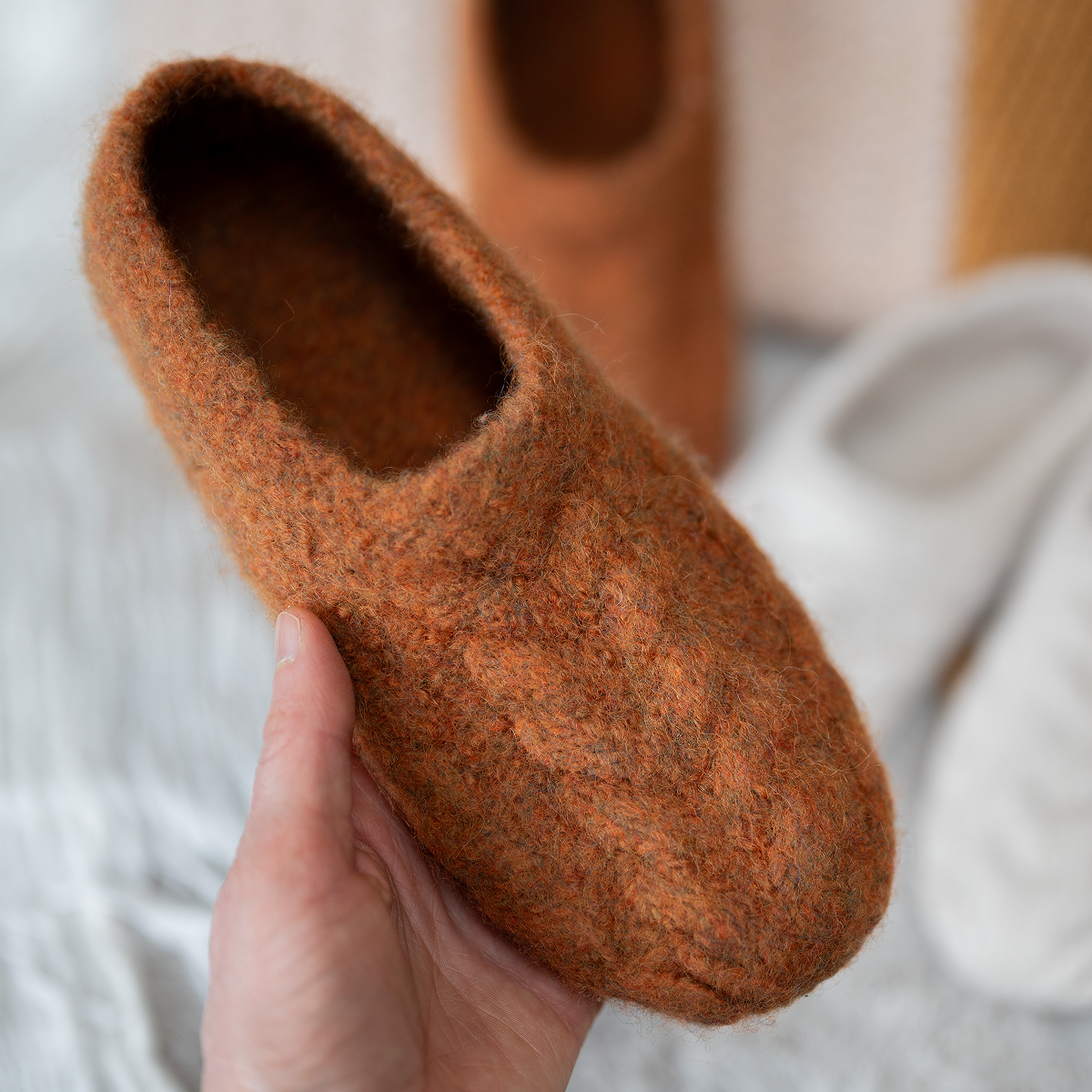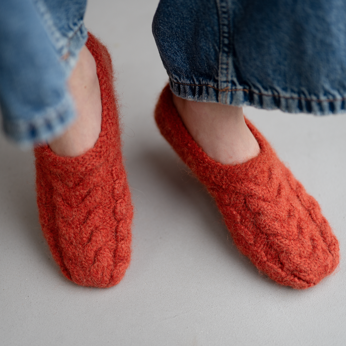 A tailored, one-piece felted slipper knitting pattern with a sculpted fit and elegant cable detail. James Felted Slippers are knitted in one piece from the ankle down, then felted into a dense, durable fabric that hugs the foot without bulky seams. A clean cable detail runs to the toe for an elegant finish.